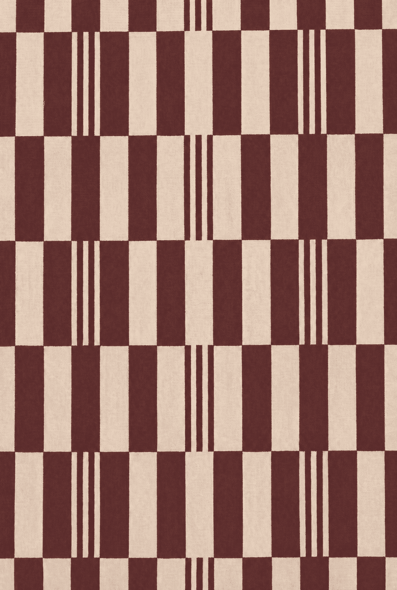 A warm bordeaux-red rug paired with a fresh linen tone in a refined checkered pattern.
